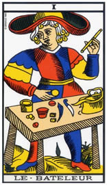 Le Bateleur, c'est le début de la réalisation. Il porte le potentiel humain. Il a des outils sur sa table en l'occurrence le bâton, le denier, la coupe, l'épée. Au niveau symbolique il joue avec les 4 éléments. Denier : Carreau, Terre, Taureau, Luc, Sel. Épée : Pique, Feu, Ange, Matthieu, Mercure. Gobelet : Cœur, Eau, Aigle, Jean, Mercure. Bâton : Trèfle, Air, Lion, Marc, Soufre.